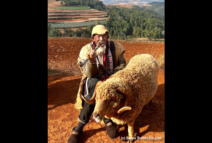専用バスにて、紅い大地が広がる景勝地・東川へ。午後は素朴な農村風景の広がる東川紅土地を見学します(落霞溝、錦繍園、千年古龍樹、七彩坡、打馬坎等)。