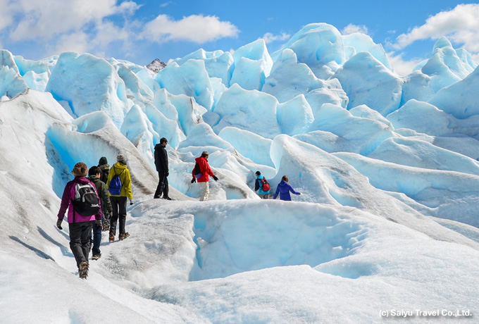 | 氷河ハイキングについて) | ペリト・モレノ氷河ハイキングは、カラファテ発着の混載ツアーとなり、主催会社の英語ガイド同行となります。ハイキングでは1時間半ほど氷河の上を歩きます。その際アイゼンを使用します。また、くるぶしが隠れる程度のハイキングシューズ又トレッキングシューズをお持ちください。アイゼンは現地にて無料で貸出しいたします。 ※66歳以上のお客様は氷河ハイキングへご参加いただけません。 |