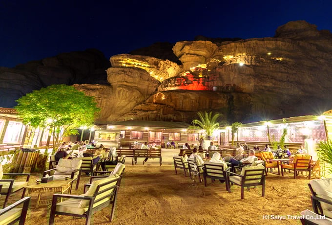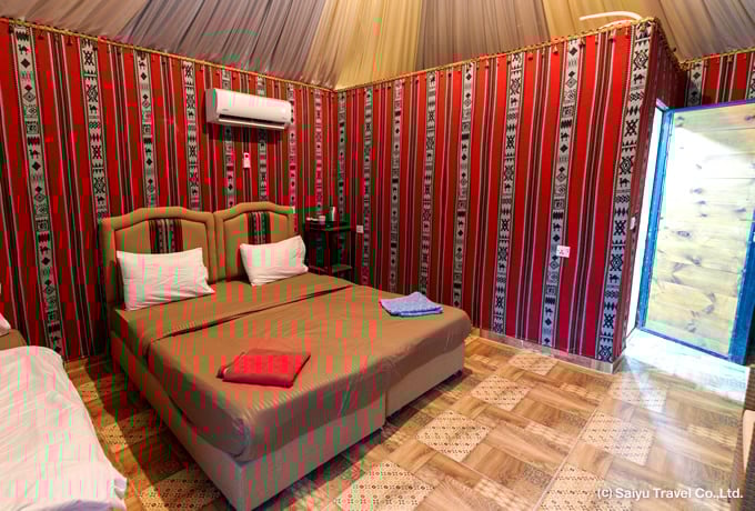 ワディ・ラムの砂漠では設備の整った常設テントスタイルのキャンプ「ハサン・ザワイデ・キャンプ」に宿泊。赤茶色の砂漠に巨岩が聳える壮大な景色の中で、夕陽や星空を楽しむことができるロケーションです。