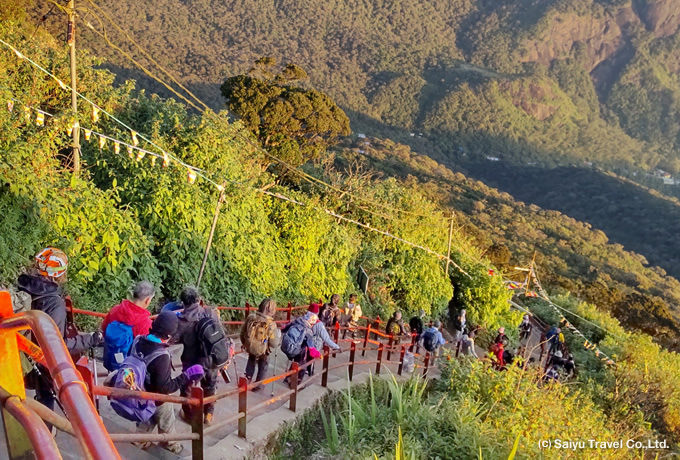 | 登山について | アダムス・ピークでは良く整備された石段の巡礼路を歩きますので、特別な登山技術は必要ありません。ただし、山頂までは5000段を超える石段が続き、約1,000mの標高差を往復することができる体力が必要です。また、頂上直下は道が狭く、多くの巡礼者で歩きづらい場合がございます。予めご承知おきください。道中には所々に休憩場所がありますので、途中でお待ちいただくことも可能です。ホートンプレインズ国立公園におけるワールズエンドハイキングは、小さいアップダウンがあり(100m未満)、途中ぬかるんでいる箇所もあるため、履きなれたハイキングシューズがおすすめです。 |