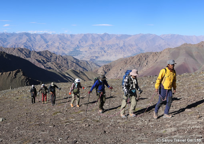 深夜にB.C.を出発し、山頂(6,153m)を目指します。晴れていれば、山頂からサセル・カンリⅠ峰(7,672m)やザンスカール山脈の大パノラマがお楽しみいただけます。