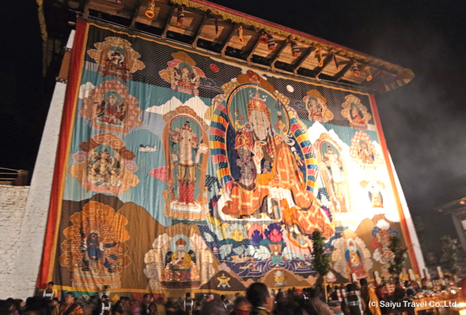 トンドルとは「見るだけで解脱ができる」ことができる大変ご利益のある大掛軸。年に一度の祭りの日、未明の暗いうちから御開帳されます。人々はトンドルの前に進み、その裾を額にあて無病息災を祈ります。完全に日が昇ると、トンドルがおろされ、翌年まで大事にしまわれます。