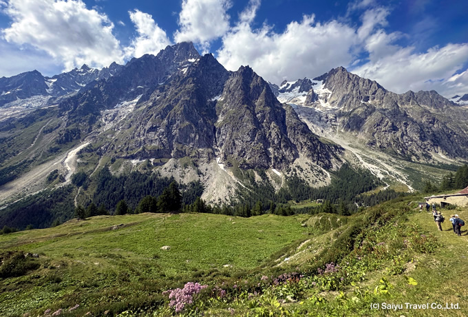 モンブラン山群の周囲を一周する、ツール・ド・モンブラン。西遊旅行のツール・ド・モンブランは一部ロープウェイや車道がある箇所の路線バス利用の他はご自身の足でしっかりと歩いていただきます。バルム峠を越えて最後シャモニ谷に戻ってきた時の感動はひとしおです。フランス・イタリア・スイスの3ヶ国の国境を歩いて越えるのも魅力です。