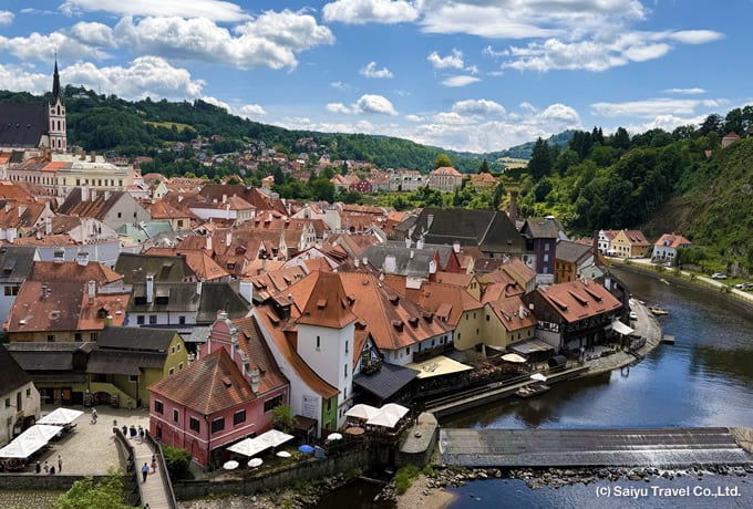 専用車にて世界遺産の街、チェスキー・クルムロフへ。ヴルタヴァ川が旧市街の周囲を取り囲み、オレンジ色の屋根と白い壁の町並みが見られる旧市街、チェスキー・クルムロフ城を見学します。
