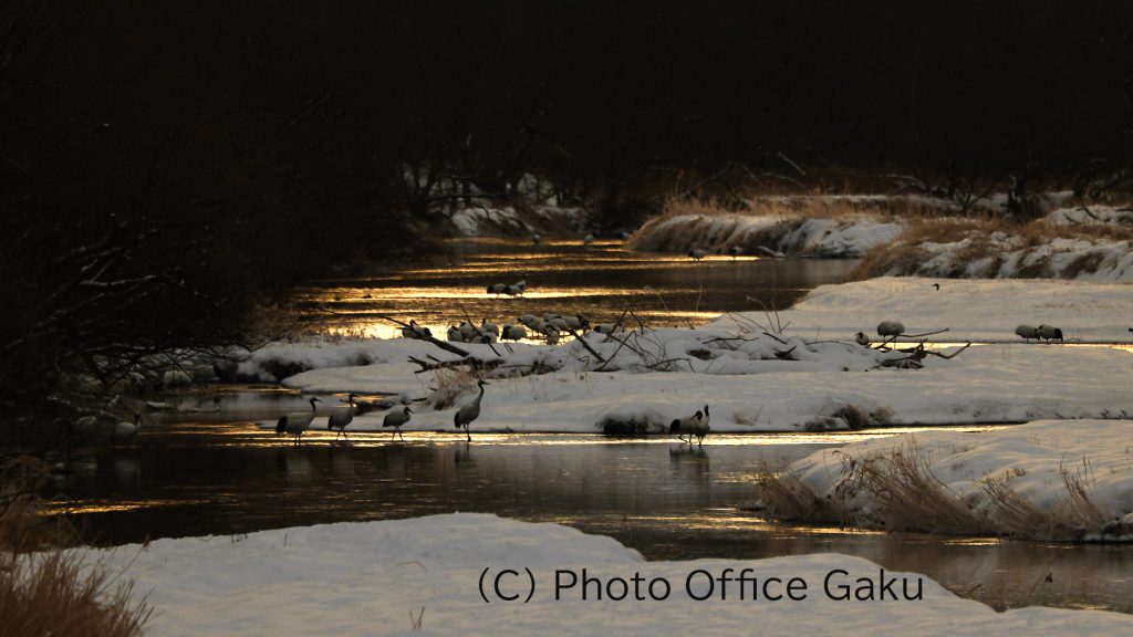昨日の夕食時間に今日の予定をどうするか相談して「気温はマイナス12度、基本は曇り」どうする?という事で1名は辞退。残りはせっかくなのでチャンスにかけるという事で6時出発。やはり空は暗く雲に覆われ、霧氷も川面に張り出した枝のみ。気嵐が出ていないので下流のタンチョウの群れは確認できるも近くにはいない。夜明け時間を超えると動きが出る。7時30分頃、近くまで来ていたペアの川面が角度によっては雲間から滲む陽の光を受けて色づいた。せっかくなのでそのシーンを撮ってもらっていると、タンチョウの群れが固まっている周辺にのみ光が差した!かなりレアなケースなのでしっかり撮ってもらう。