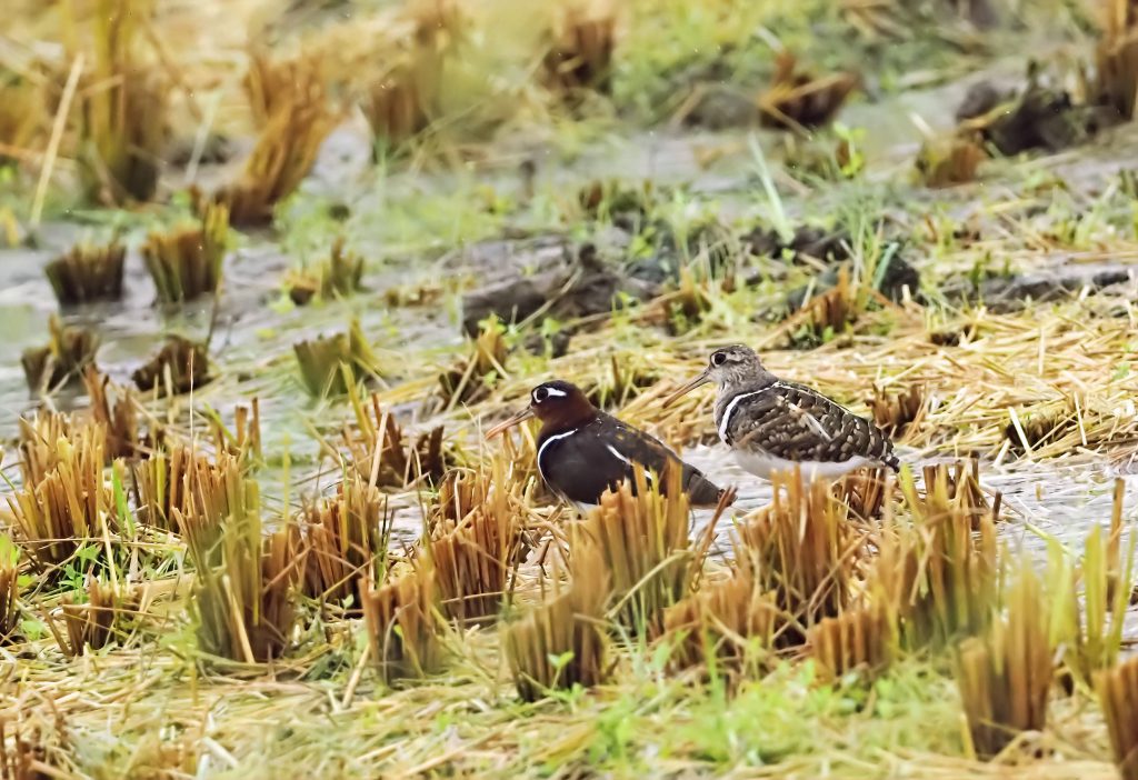 幸いにも台風の勢力は弱く、しかも足早に通り過ぎていきました。再再出発です。再び平田原へ。ムラサキサギが飛んできました。降り立った位置がよく見えないので移動すると、なんとタマシギのつがいがいました、これはラッキー!こちらをやや気にしているのか、段々と遠ざかっていきました。ムラサキサギの存在を忘れてしまうほど、みなさん、タマシギに夢中でした。他、セイタカシギの群れ、シロハラクイナの親子などを観察しました。
