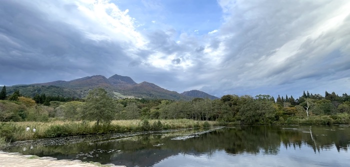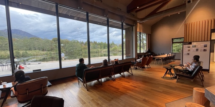 トレイルの起点となるいもり池。妙高山を望みながら素敵なビジターセンターのカフェでゆったり。