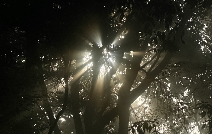 雲が立ち込める下界から山上へ。晴れ空になる境目、美しい光芒が見られ、皆で夢中に写真からを撮りました。