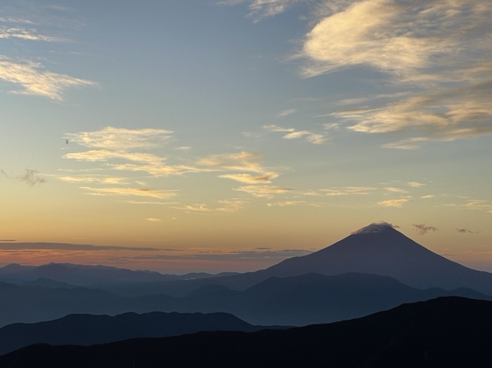 雲が立ち込める下界から山上へ。晴れ空になる境目、美しい光芒が見られ、皆で夢中に写真からを撮りました。