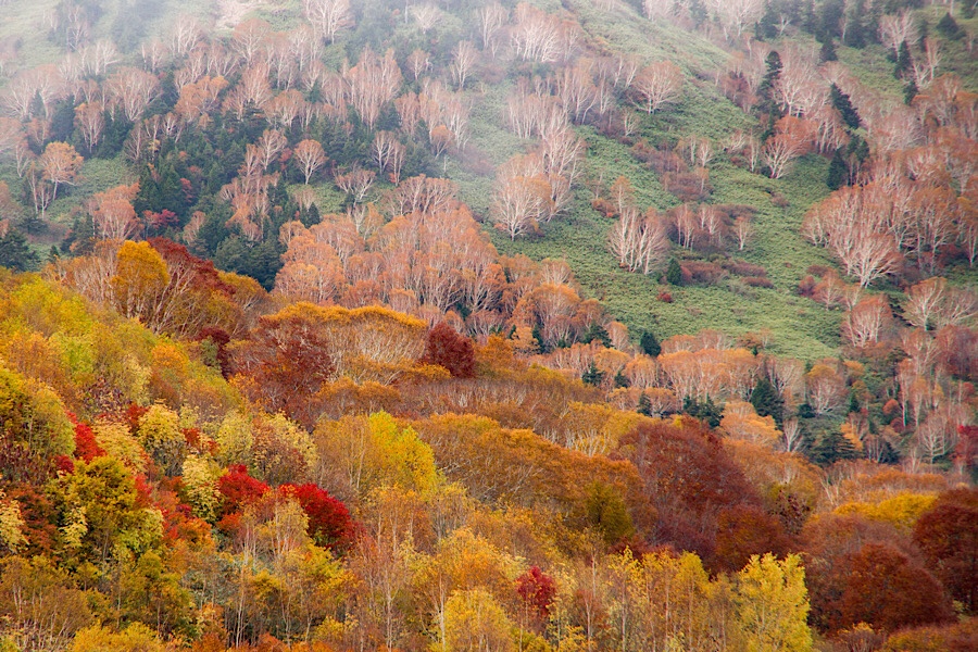 八幡平中腹は広葉落葉樹の森が真っ盛り、そして標高が高くなるにつれオオシラビソ、そしてダケカンバの樹形が美しい。