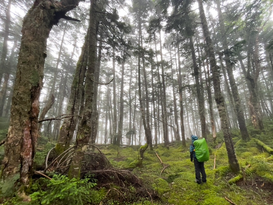 前半戦は鬱蒼とした南アルプス南部の森を抜けます。森では大半が雨やモヤがかかる景色で写真を撮るには最高の美しさでした。小さな苔むした小宇宙に魅了されました。