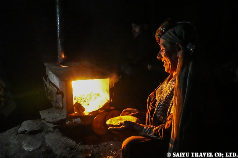 シャラビラ作りは夜に行われます。ちょうど訪れた時、谷に電気がなくストーブの火の光で美しい光景を見ることができました。女性がクルミのパンを焼いていました。