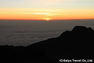 キリマンジャロ登頂5日目は、23時にキボハットを出発し登山開始。ヘッドランプの明かりを頼りにつづら折りの道を登ります。ハンスメイヤーズケイブ(5,150m)を過ぎると急に風が強くなり、気温も下がり、岩場が多くなります。ふと見上げると、ギルマンズポイントがすぐそこに見えます。しかし、到着までにはまだまだ時間がかかります。本日は1,280mも登らなければなりません。岩場を抜けるとついにギルマンズポイント(5,682m)に到着です。喜びもつかの間、少し休憩して、ウフルピークを目指し歩き始めます。ステラポイント(5,730m)に到着すると、朝陽が昇り、目の前に氷河が現れます。 ここは赤道付近にもかかわらず、キボ峰の頭頂部には20世紀後期まで巨大な氷河が存在していました。近年は、気候変動(温暖化、降水量の減少など)にともなって規模が極端に縮小しているとはいえ、氷雪を見ることができます。 ここからは最後の力を振りしぼり、一歩一歩、歩みを進め、ついにウフルピーク(5,895m)に到着です。