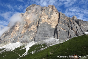 車で移動し、モンテパナからリフトでサッソルンゴの裾野へ。2日かけての周遊トレッキングです。こちらもアップダウンも多くなく、ドロミテらしい景観を楽しめるコースです。サッソルンゴはずっと遠くから見ていた山。岩壁も見事で、クライミングルートもたくさんあります。