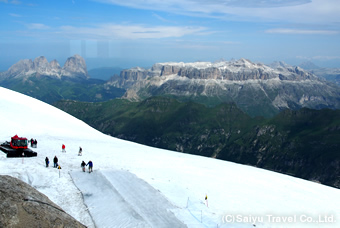 朝起きると、小屋前のフェダイア湖にマルモラーダが綺麗に映っていました。9時の運行開始に合わせて、ゴンドラ乗り場へ車で移動。マルモラーダのゴンドラは2回乗り継ぎで、約2000mの高度差をわずか10分で一気に上がります。高山病対策で、深呼吸しながら歩きます。一つ目のゴンドラで雲を突き抜け、上は好天です。本来であれば、旅のハイライトとして今まで通ってきたコースを上からは眺めることができるのですが生憎、雲に隠れて見ることができませんでした。その代わりに、見事な雲海と、一瞬だけ雲の上の現れたブロッケン現象を見ることができました。
