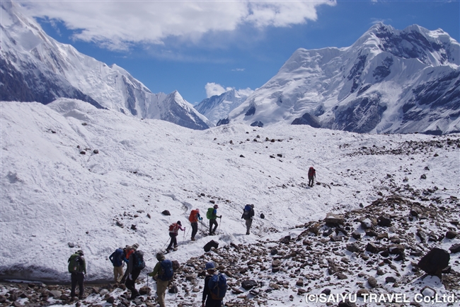 トレッキング7日目です。モレーン、白い氷河を横切ってイニルチェク氷河BCへ歩みを進めます。