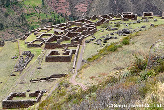 遺跡内には30人程の人が住んでいたと言われますが、神官を中心に年齢の高い人々が多く住んでいたと考えられ、廊下、階段には手すりが付けられています。また、この遺跡は3,600mの尾根上に位置しますが、水道があります。約500年前に造られ稜線上にあるにもかかわらず、さらに高いところから延々と水路を引いてきたのです。当時の測量の技術レベルをうかがえる貴重な遺跡です。