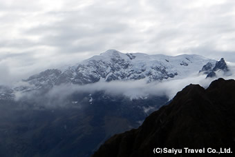 パカイマヨを出発し、急登を登っていくと、再びベロニカ峰が姿を現します。斜面の中腹に半月の姿が美しいインカ時代の遺跡「ルンクラカイ」遺跡が姿を現します。この遺跡は、ケチュア語でルントゥ(卵)ラカイ(建物)と呼ばれていたことからこの名前がつきました。遺跡は関所であり、旅籠だった場所です。ここへ向かう旅人や『チャスキ』の宿場や食料や物資の貯蔵庫としての役割も果たしました。