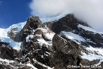 まず訪れるのがチリ側のパイネ国立公園。ここには主な岩峰群が3つあります。このコースではパイネ国立公園の「THE “W”」といわれる湖畔のメインルートを2泊3日かけて東から西へ歩きました。まず初めにピストンで訪れたのは、国立公園の東に位置するトーレス・デル・パイネ。樹林帯を抜けると石がごろごろしている登りが始まります。氷河湖への最後の坂を上り終えると目の前には聳え立つ3本の岩峰、そして眼下にエメラルドグリーンの氷河湖が広がります。この山を目の前にした時の感激は期待を上回るものでした。岩峰の麓にはまだ溶け残った氷河が固まっています。ここで昼食とし、たっぷりと写真撮影などを楽しんでいただきました。 |