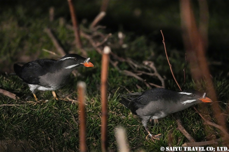 暗くなり、ウトウが戻ってきました。この時期は抱卵中で雛がかえった後のような勢いのある帰巣風景ではないですが、イタドリに覆われていない巣穴が見えるウトウ繁殖地では、戻ってきたウトウがまる見え。また雛に魚も運んでいないのですぐに巣穴に戻る必要もなく、ウトウの写真を撮りやすいのがこの季節です。