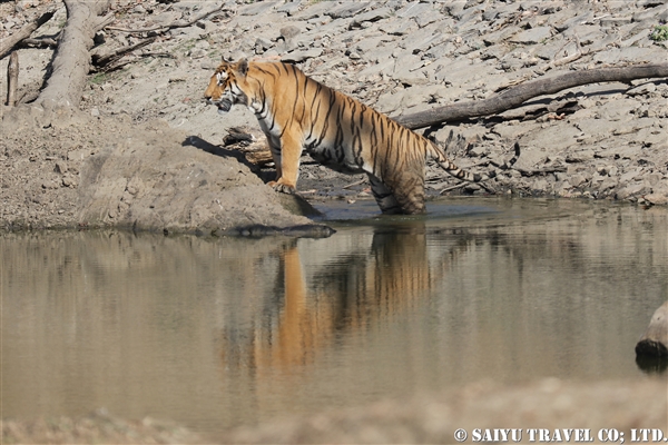 ランタンボール国立公園のレイク・エリア(Zone 3)で、この湖付近を縄張りとするT-19 クリシュナの子供2頭を観察することができました。2014年の4月に訪問したときには、母トラとそのそばを歩く4頭の赤ちゃんトラの姿を撮るためにカメラマンさんが殺到していました。その子供も今は成長し、1頭は少し離れて暮らし、2頭が母トラと同じエリアで暮らしていました。トラは生まれてから1年半~2年を母トラと過ごし、独り立ちするといわれています。この子達は1才+、体も大きくなっていますが子供らしい表情が残っています。