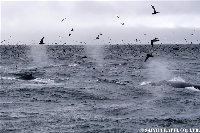 そしてこちらも長距離の渡りをする ハシボソミズナギドリ Short-tailed Shearwaterの群れ。ベーリング海までオキアミを求めてはるばるオーストラリア南東部・タスマニアからやってきます。コマンドルスキー諸島もザトウクジラが見られ、オキアミを求めてハシボソミズナギドリもやってくるわけです。
