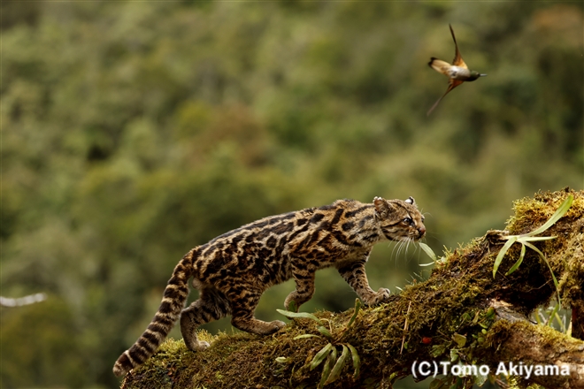 クラウドジャガーネコはキタジャガーネコの亜種として考えられていて、最近の遺伝研究でまったく別の進化をしていたとわかり、2024年の2月に新種として記載されました。雲霧林の中に暮らす小型の野生ネコですから、センサーカメラでの撮影以外はほとんどこの世にでることはなかったのです。それがコロンビアの野鳥観察のためのフィーダーに鳥を狙っ定期的に表れているという情報を2025年の2月に聞き、コロンビアへのツアー10月に作りました。ツアーの日程はすでに決まっていますので、空いた時間に無理に入れたので、アルゼンチンのバルデス半島からカタール経由で帰国し、日本に中2日でメキシコ経由でコロンビアに向かうという強硬日程でした。5日でほぼ世界1周したことになりました。身体への負担は大きかったですが、ほぼまだ誰も見ていなかった野生ネコの種を見られたのですから価値がありました。アムールヒョウとともに2025年に観察できてうれしかったNo1です。