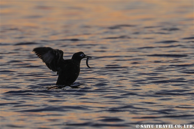 This is a guillemot that is carrying some fish in its beak. Probably it has caught the Pacific sandlance? The common name in Japanese for the guillemot translates to “Red legs” derived from the Ainu name “Keima hure” because of its noticeable bright red legs. The English name is based on the smart pair of glasses the birds wear, Spectacled guillemot, due to the white patterns around its eyes. Either way, however, it is hard to understand these descriptive names in this back lit scene.