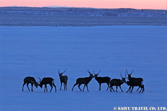 These are some Ezo Sika Deer with the Kunashir Islands in the background. At this time of year, they have winter fur and are very cute, but they have a voracious appetite and are highly successful at reproduction, so in some areas they are being exterminated due to damage to agricultural areas. At Shiretoko Sarai, the venison is added to the menu so it is not wasted.