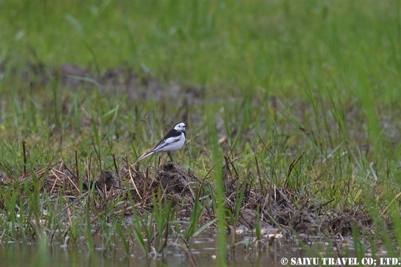 After breakfast, we didn’t have much time. But it would have been nice just to see the White-backed woodpecker (Austin Ooakagera), so we searched for it on the way to the airport, but we could not spot it. Finally, we went to a rice paddy, where some migratory birds, might be around. Despite the rain, we were able to see the White-Breasted Waterhen (Shirohara kuina) and the White Wagtail (Houjiro hakusekirei, Motacilla alba leucopsis), the Black-winged Stilt (Seitaka shigi) and other species.