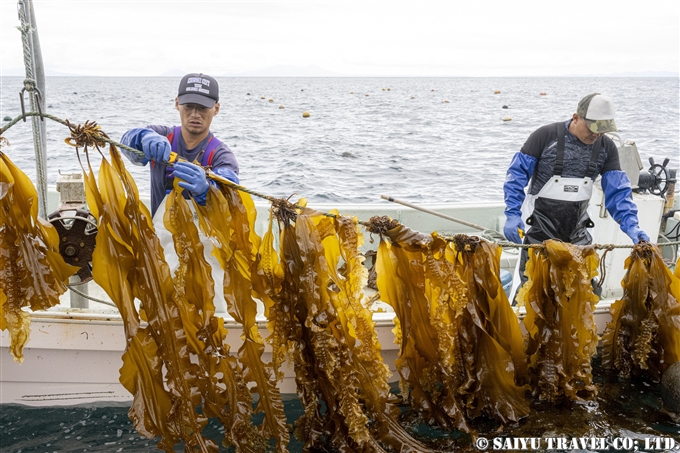 The harvest is conducted from late July to the end of August. During the kelp harvest, you can see the kelp lined up on the stone beach on the way to the Aidomari fishing port, only 25 minutes away from central Rausu by car. At its peak, the whole town is wrapped in the nice scent of kelp.