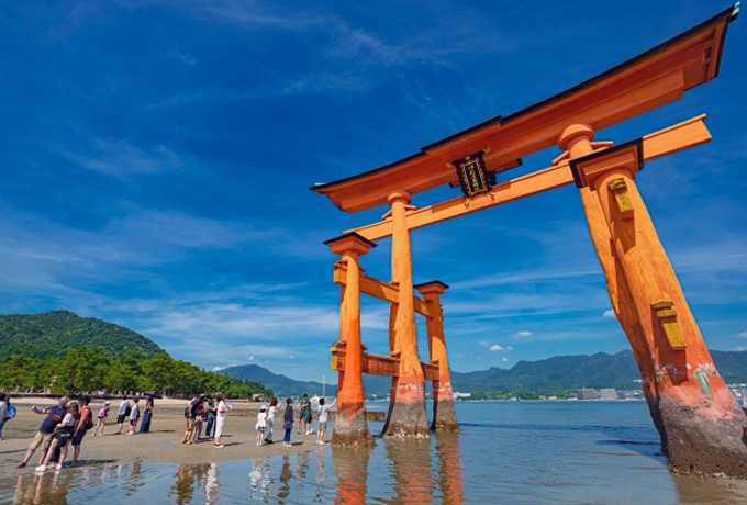 We will spend at Miyajima island approximately 5-6 hours to see the Itsukushima shrine and famous huge torii vermilion gate at both high and low tides. In the morning when you first visit Itsukushima shrine, there will be the high tide, and shrine will appear as if floating on the sea. When it starts changing to the low tide. you will be able to walk to the torii gate before you leave. Also, we take you to the Miyajima viewpoint by ropeway ride, and give you ample free time to stroll along the approach to the shrine.