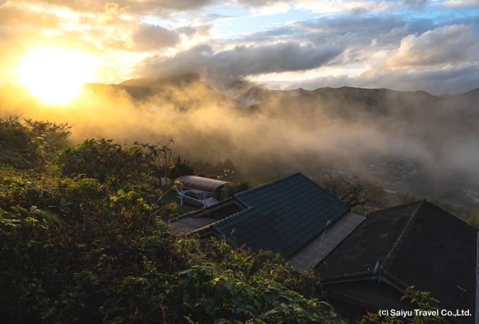 早朝、宿の窓から見渡す高原の景色早朝、宿のスタッフの笑顔に見送られて出発。
