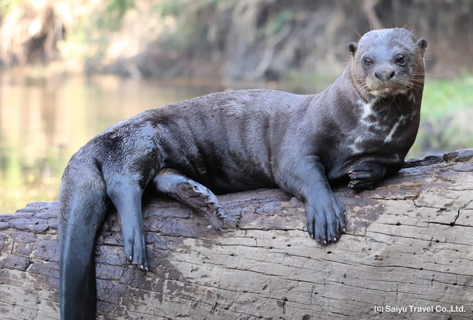 体長85-140cm。尾長33-100cm。体重オス26-34kg、メス20-26kg本種のみでオオカワウソ属を構成する。よく鳴き声をあげ、9種類の鳴き声を使い分けていると考えられている。絶滅が心配される動物であるが、パンタナールでは普通に観察できる。ボートで追いかけると魚を捕まえ音をたてながら噛み砕くのも観察できる。個体数は減少していて現在約1500頭しかいないと考えられている。ジャガーよりも総個体数は少なく観察できるのは貴重なことだ。