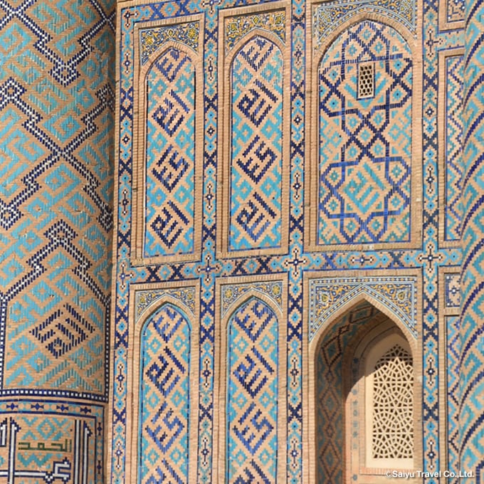 ウズベキスタンの旅の魅力のひとつは、その美しい建築物にあります。14世紀、この地に大帝国を築きあげたティムールは、征服地から数多くの技術者を集め、都市の壮麗化に力を注ぎました。彩釉タイルなど装飾技術も発展を遂げ、サマルカンドをはじめとするオアシス都市には絢爛たる建築物が次々と誕生していきました。16世紀以降、喜望峰の発見によりシルクロードの隊商貿易が停滞していくなかも美しい建築物は作られ続け、いまも世界中の人々を魅了しています。
