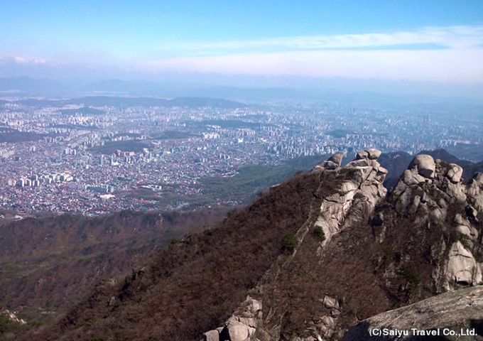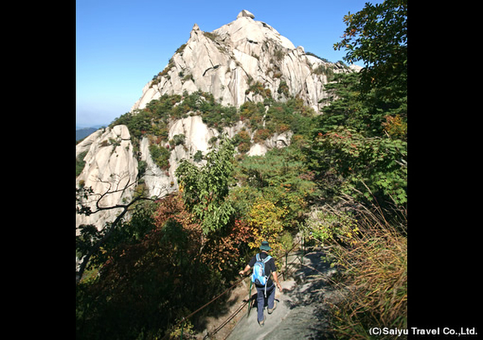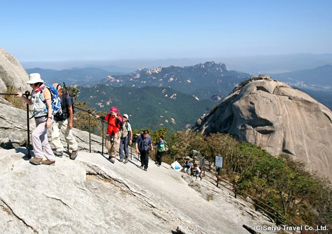 ●北漢山(プッカンサン)ハイキング(約5時間) 専用車にてソンウンサ登山口(140m)へ。 正面に花崗岩の大岩峰・仁寿峰(インスボン)を眺めながら稜線を進み、白雲山荘から北漢山最高峰・白雲台(ベグンデ:837m)を往復。道洗寺(トソンサ)登山口(280m)へ下山。の昼食後、専用車にて空港へ。航空機で東京・大阪それぞれ帰国の途につきます。着後、解散。 |