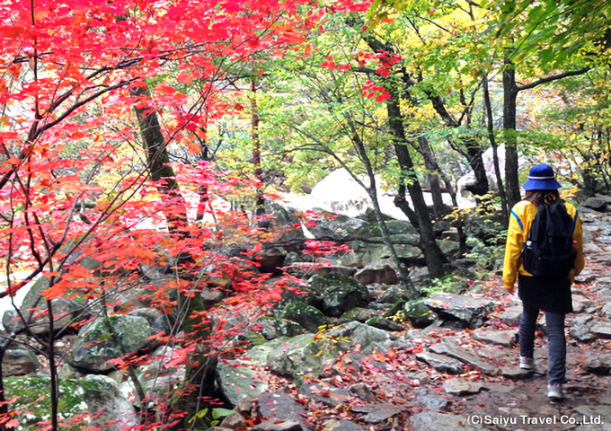 雪岳山(ソラクサン)は、降り積もった雪が長く残り、岩石(花崗岩)が雪のように白い色のため、雪岳と名付けられたと言われています。漢拏山(ハルラサン:1,950m)、智異山(チリサン:1,915m)に次いで韓国で三番目に高い山で、朝鮮半島を南北に連なる太白(テペク)山脈の盟主としても知られています。ツアーでは、眺めのよい稜線歩きを楽しみながら、雪岳山最高峰・大青峰(テチョンボン:1,708m)直下の山小屋で一泊し、翌日は、赤や黄など秋色に彩られた千仏洞(チョンブルドン)渓谷を下ります。韓国屈指の山岳景観とこの時期にしか味わうことのできない紅葉の見事なコントラストをお楽しみください。