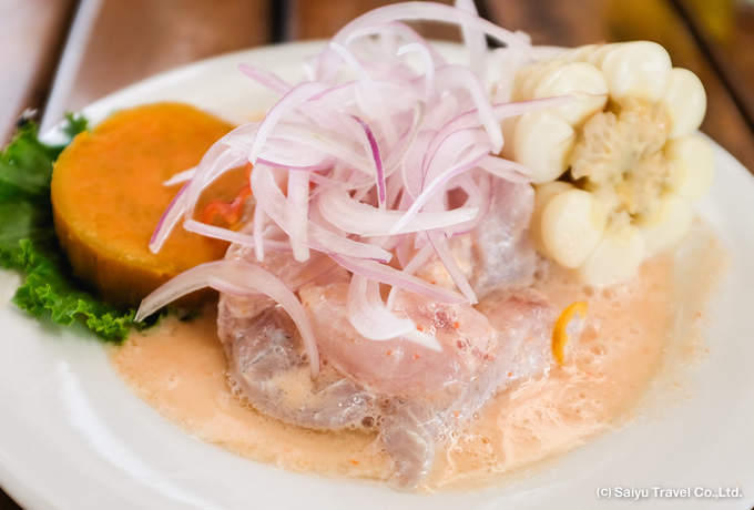 沿岸部でとれる新鮮なシーフードやアルパカ肉、じゃがいもなどのアンデスの恵みをふんだんに用いたペルー料理。ツアーではレモンの効いた風味豊かな名物料理「セビーチェ」もお召し上がりいただきます。ブドウの蒸留酒でつくられた国民的カクテルのピスコサワーとの相性は抜群です。