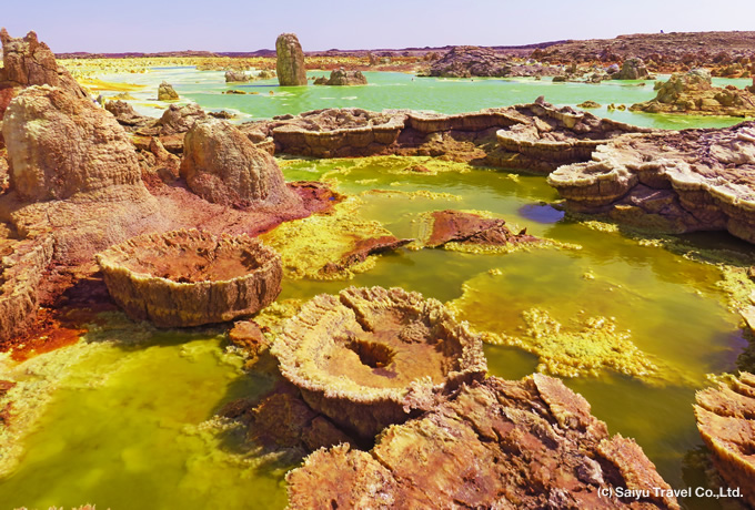 エチオピアとジブチの間にある塩湖の近くにチムニーと呼ばれる煙突状の石灰堆積物の柱が見られます。映画「猿の惑星」の撮影が行われた場所として知られています。