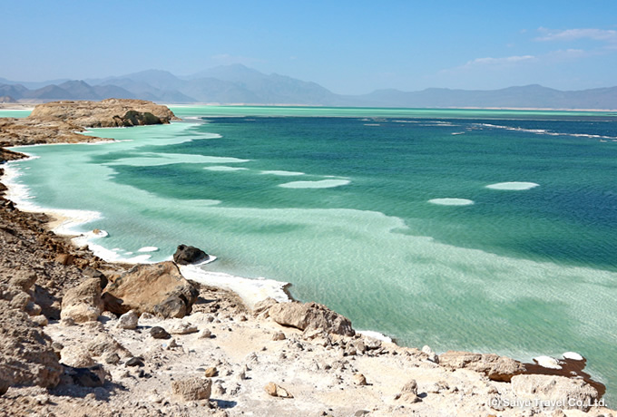 アフリカで最も低い海抜マイナス155m、ジブチの中部にあるクレーター湖。ここでは湖岸で塩が採掘され、珍しい円形の塩が有名です。