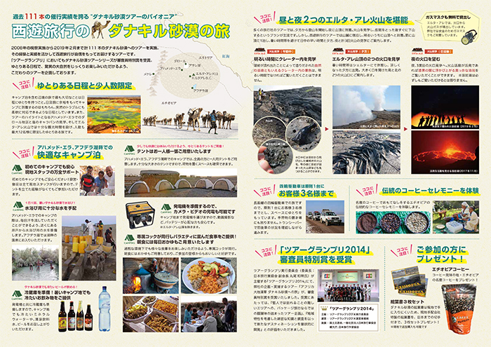 | エルタ・アレ火山の登山について | 健康で片道約4時間のルートを歩くことができる体力が必要です。火口からは火山ガスが噴出しているため、心臓や呼吸器系の疾患のある方はご参加をご遠慮ください。宿泊に必要なお客様の荷物、キャンプ道具、食料、水等はラクダで荷揚げします。 |