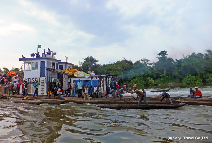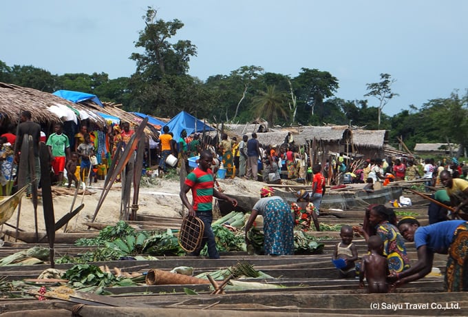 ●コンゴ川下り コンゴ川中流の港町ブンバへ。 港には平底船が並び、活気ある物流の中継都市ブンバを散策します。キャンプ地は村の中を予定しています。 コンゴ川流域:キャンプ泊