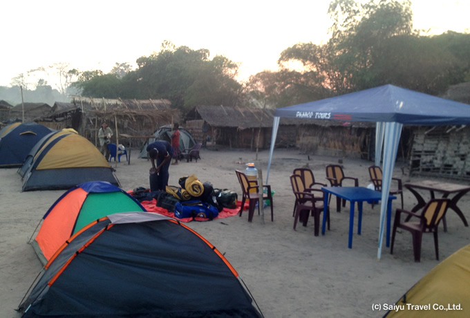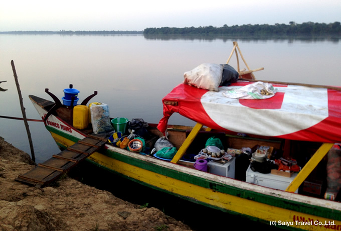 キサンガニの港へ。 ●コンゴ川下り 専用ボートに乗り換えて5泊6日の舟旅が始まります。 キャンプ地は川岸に停泊し、テントを設営します。 コンゴ川流域:キャンプ泊