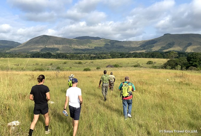 観察制限の厳しいマンドリルやゴリラのトレッキングに合わせ、1グループの人数を制限。これらの観察には全行程に添乗員として秋山知伸さんが同行し、密度の高い野生動物観察をサポートします。