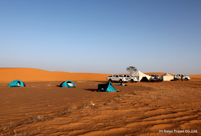 | キャンプについて | キャンプ泊では寝袋(三季用又は冬用)が必要です。お持ちでない方には弊社より有料(8,000円)で貸し出しいたします。毎日の飲み水は十分にご用意いたしますが、水が貴重な地域ですので洗顔などの利用は量が限られます。また、キャンプ地は天候により変更する場合があります。 |