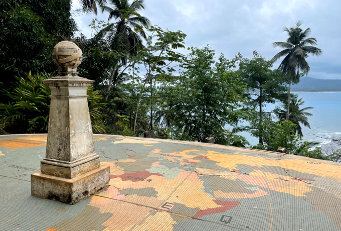 終日サントメ島の観光。島の最南部まで足を伸ばします。かつてのプランテーションの労働者達のために建てられたポルトガル統治時代の病院跡地やプライアペスケリアの滝を訪れる他、悪魔の口と呼ばれる奇岩ボカ・デ・インフェルノ、島のランドマークでもある親指を立てたような岩峰ピコ・カオグランデ(663m)を遠望します。海況が許せば、島最南端の町ポルトアレグレよりボートでロラス島へと渡り、徒歩で散策して赤道記念碑を訪れます。 サントメ島泊