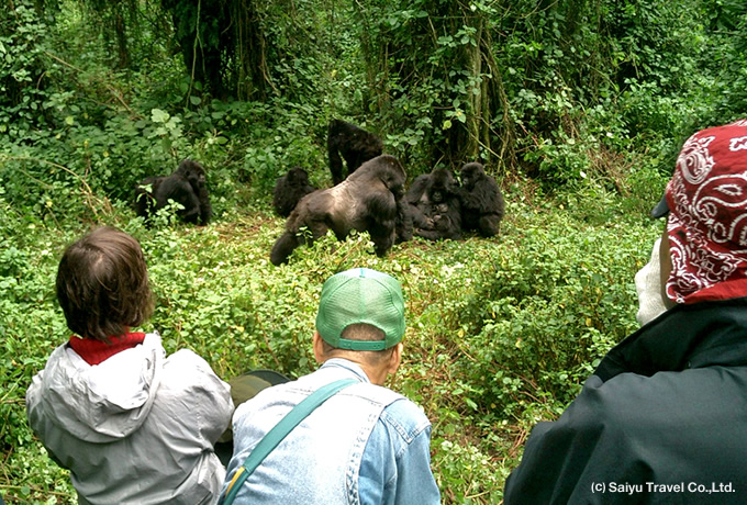 | 観光について | ゴリラトレッキングでは標高2,000m前後の山間部を歩きます。ゴリラの群れがどこにいるかによって歩行時間は大きく変わり、最大で往復6時間程度となります。なお、ゴリラの観察は1時間が許可されています。また、ゴールデンモンキートレッキングは公園入り口から高低差400m前後の竹林まで往復歩きます。参加人数によっては2グループに分かれてのトレッキングとなります。自然観察ですので、写真や日程表中の動物が必ず見られるとは限りません。予めご了承ください。 |