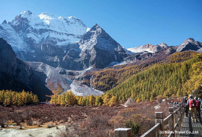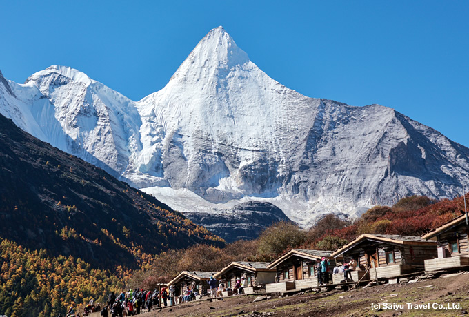 四川省の最西部、雲南省との省境近くに位置する稲城亜丁自然保護区。仙乃日(シアンレリ:6,032m)、夏諾多吉(シャルオドジェ:5,958m)、央邁勇(ヤンマイヨン:5,958m)の6,000m級の三神山が聳えています。また、これら三山はそれぞれ観音菩薩、金剛手菩薩、文殊菩薩に見立てられ、チベット族の崇拝の対象となっています。標高4,000mを越える高所にありながら園内のほとんどの場所は遊歩道が整備されており、登山に比べ比較的気軽に雄壮な高山風景をお楽しみいただけます。牛奶海(4,600m)と五色海(海抜4,700m)の2つの山上湖は、鮮やかで透き通ったエメラルドグリーンの水を湛え、「天空の湖」と称えるにふさわしい優麗さを備えています。往復10kmの絶景ハイキングでシャングリラを目指します。