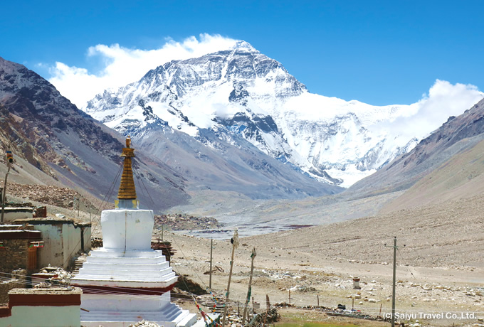チベット語でチョモランマ、英語でエベレスト、ネパール語ではサガルマータと呼ばれる世界最高峰。チベット側からは手前に遮る山がないため、迫力の山容をご覧いただけます。