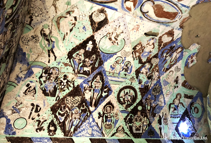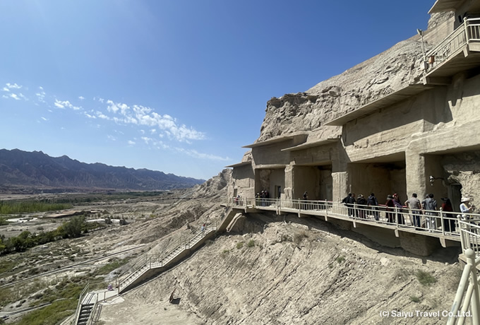 3~8世紀にかけて造られたクチャ郊外のキジル千仏洞。236の石窟が残され、その壁画総面積は約1万㎢。新疆ウイグル自治区で最大規模の石窟です。塑像は破棄されてしまいほとんど残っていませんが、内部には素晴らしい壁画が現存します。壁画の題材は、釈迦の誕生から涅槃までの仏伝図、釈尊の生前の物語と古代西域の各民族の人々を描いた風俗画など。ラピスラズリの青色を多用した鮮やかな色彩の壁画が見られます。